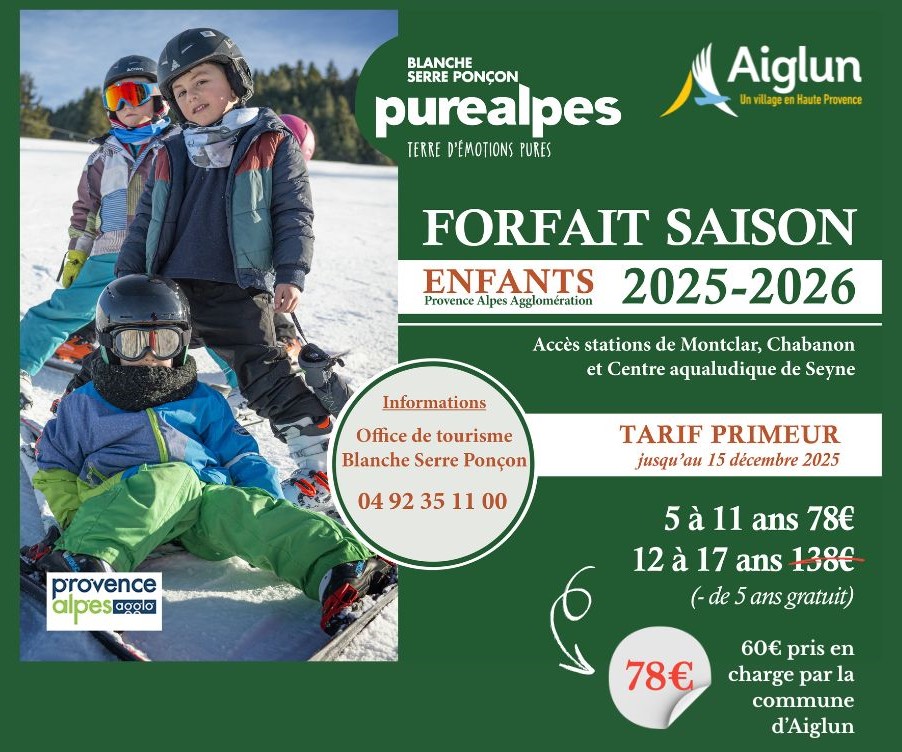 Cette décision offre aux jeunes de 12 à 17 ans résident Aiglun d’acheter un forfait valable dans les stations de Montclar, de Chabanon et au centre aqualudique de Seyne à 78€ au lieu de 138€. La vente des forfait se fait alors par l’intermédiaire de Montclar domaine skiable et SATOS Chabanon.